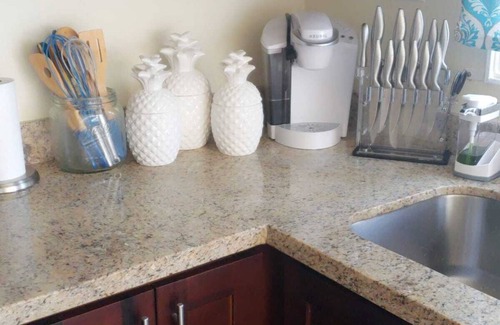Tranquility At The Manor; A home away from home, featuring the latest well chosen dark stainless steal appliances and furniture for your comfort such as: LG pro-bake conventional stove, a four door multi- freezer fridge, smoothie mixer, PowerGrill glass bottom integrated microwave, Keurig K-cup classic coffee maker, toaster oven, Glass table, Velvet covered couches complamented with two wing chairs and a lazy boy finished with nail head design to showcase a luxury modern look.