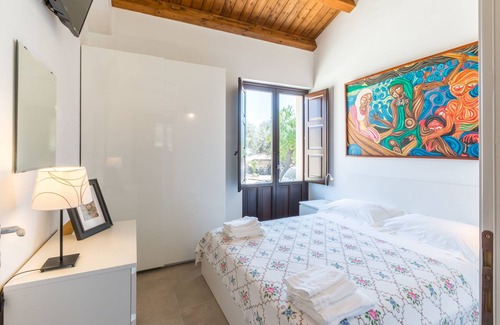 Nestled in the hills of the Iblei Mountains, where fauna and flora still accurately reflect the ancient Sicilian tradition (ancient olive trees, carob, almond trees and vines) stands this old building, built in the first half of 1700 with mainly agricultural. It consisted of stables, millstone for processing grapes and trappeto for the processing of olives and therefore the production of oil. At the end of 1900 it was purchased by its current owner, who with care, dedication and an absolutely conservative renovation has restored it to its former glory. This holiday house totally immersed in nature also offers beautiful views of the Ionian Sea. The owners are artists who painted the pictures inside the house and they have also made all the stone work .It 's possible also visit the premises of Trappeto where you will find exposed the tools used in the work of the fields over the ancient millstone lava stone and the press. The structure has been treated in detail: history, style and practicality come together in perfect union. The area is much sought primarily for its white beaches and crystal clear waters. The house can accommodate up to 7 people, in a fully furnished and renovated environment that consists of 1 entrance hall, lounge, kitchen, 3 bedrooms and 2 bathrooms with shower and washing machine. The exterior is furnished with tables, chairs, umbrellas, hammocks, deck chairs and barbecue. The swimming pool and the parking are for the exclusive use of guests.