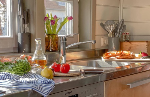Experience in our dreamy pilot house the incredible idyll of the small fishing village Rieth am See. The house with its oiled wooden floorboards from the region and colors of Farrow and Ball reflects a Baltic Sea atmosphere that makes a holiday on the lake an experience. What could be better than going to the sauna in the Schäferwagen after a long walk on the water and ending the day by the fireplace with a glass of wine from your own wine rack?