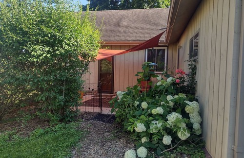 This is an efficiency unit attached to our home, but completely separate and private. You'll have one dedicated parking space in our driveway near your private patio entrance. Walk in to a charming kitchen/living area with a gas fireplace and view of the bluffs. The wall of windows to the East lets in all the morning sunshine yet has a flowery privacy film so no one can see in! Upstairs you'll retreat to a large bedroom with Queen bed, dresser, vanity table and a wall of storage cubes for all your belongings. Again, these windows also face East for the morning sun, but have the privacy film on as well as black out curtains. AC units in both the main level and upstairs bedroom. The walls adjoining the main home and the efficiency unit are double 2 x 4 walls with triple sheetrock and double thick insulation to keep the noise between the two barely audible. We live on the premises so we are available if you should need anything, but we respect your privacy.