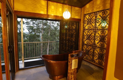 A uniquely stunning three-level treehouse in the Gold Coast Hinterland overlooking the Gold Coast city lights and Water views. Enjoy the copper bath on the third level. A Boutique style Eco Retreat. Instant hot water and cooking by gas and a beautiful array of night time lighting powered by battery & solar.Block out blinds and beautiful kitchen utensils. Many recycled materials used with local iron bark and blood blood used throughout the space. Many animals & walking tracks & local attractions. Disability access with all you need on the first level, if you can not access the second or third level, access to these are by a stunning one piece galvanised spiral staircase.