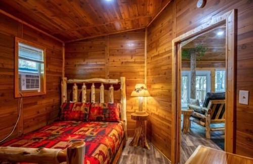 Deluxe Cabin (with Bathroom) - Sleeps up to 8 people. Tree House Imagine glamping with a real trees growing in the center! No worries about climbing steps, this is a ground level tree house! 2 bedrooms with linens provided, Handicap Accessible. Full bathroom with shower, Kitchen with stove top and full size fridge. Dishes and cookware provided. You'll love the dishwasher ice maker too! This cabin does not allow pets.