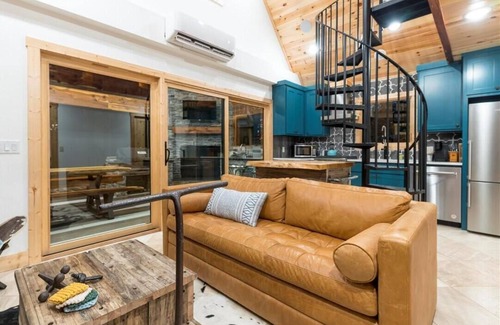 The attached ground level house has a full bathroom and the couch in the living room can pull out into a queen sized bed, which has a custom quality mattress to ensure a good night's sleep. There is a full kitchen and spiral stairs leading to the loft bedroom above, which has a queen sized bed as well. Off of the kitchen there is an arcade game room and an in-unit washer and dryer.