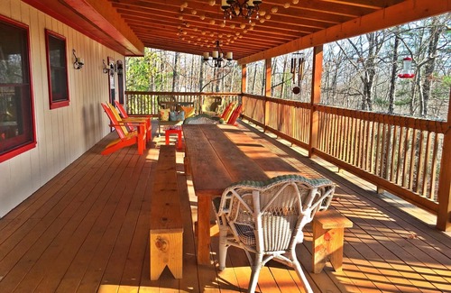 Enjoy your meals inside at a table seating four or dine outside at a large table on the fabulous 55 x 15 foot covered porch. Twinkle lights above the deck makes for a magical dinner party.