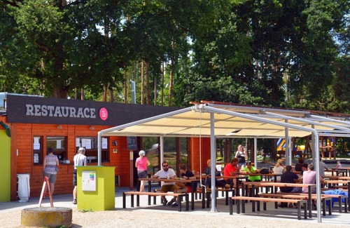 Child friendly holiday village "Kemp Stříbrný rybník". 25 houses in the resort. In the district of Malšova Lhota, 5 km from the centre of Hradec Králové, along the wooded area, on the lake. For shared use: property. Table tennis, boccia (extra), beach volleyball, arbour, barbecue, fireplace, children's playground, bathing jetty. In the complex: reception, restaurant, bar, bistro, WiFi, playroom, washing machine (for shared use, extra), bicycle rental. Parking (extra) on the premises. Bus stop "Stříbrný rybník" 700 m, railway station "Blešno" 5 km, sandy beach, bathing lake 50 m. Sports harbour, minigolf, sports centre, walking paths from the house, cycle lane, fishing possibilities 50 m. Nearby attractions: Adventure park Firmsport, letní kino, tutistický vláček do lesa, Stezka siluet, Rytířské hradiště 3 km, Park Na Větvi 3 km, Obory se zvěří 4.2 km, Obří akvárium, Botanická zahrada 4.7 km. Hiking paths: Pohádková, Vodnická stezka 6 km, Planetárium, planetární stezka 8.4 km, Zoopark Stěžery, Rozhledna Milíř 15 km. Please note: entertainment in the season. Suitable for families. Fishing [permit required]. No running water in the house.
