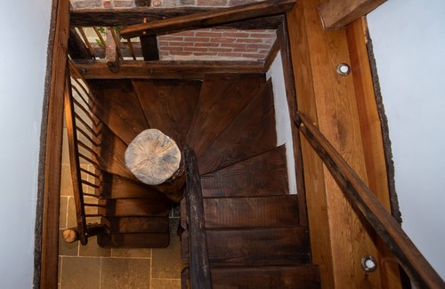 Master bedroom upstairs, reached via a private staircase. A “tree‑house”-style sanctuary with vaulted ceiling, original beams, and an indulgent copper freestanding tub plus rainfall shower in its en-suite wet-room.