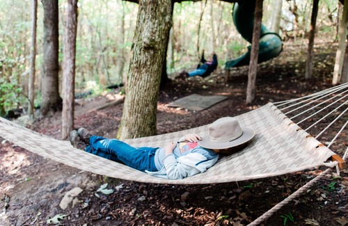 The Hickory Treehouse is a favorite for families! It features a playground area with a slide, swing, and two hammocks, plus a cozy nook stocked with games. This treehouse is best suited for two adults and 3-4 younger children.