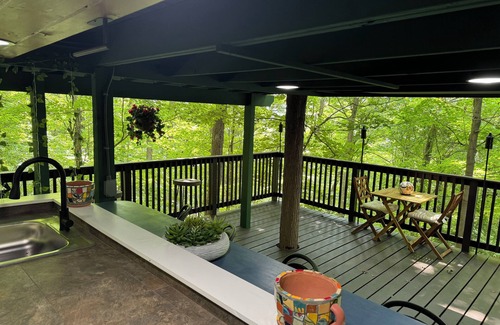 The outdoor kitchen situated on the lower-level deck of the treehouse comes with a 2-burner stove, a sink with running water, sponge and soap for washing/cooking. The outdoor kitchen has electricity. We also provide a cooler for your convenience. There is a French press and an electric percolator available to make your coffee.
