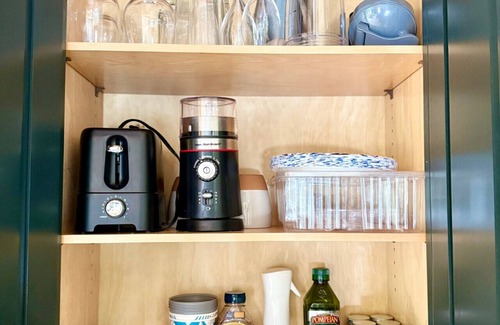 Grab a blanket and cozy up next to the modern gas fireplace for those cool evenings. There’s a skylight just above the king size bed for night sky gazing with a remote solar shade to keep you sleeping in the wee morning hours. A rain shower for two in the walk through bathroom including a relaxing soaking tub and plush robes for your comfort. The kitchen offers an indoor/outdoor coffee bar and tiny appliances for all your cooking needs. Outdoors you'll find a hot tub placed sweetly next to towering Eastern Red Cedar trees with a privacy fence, a separate deck for grilling or nesting in the trees and fire-pit below with ambient lighting for smores or story telling!