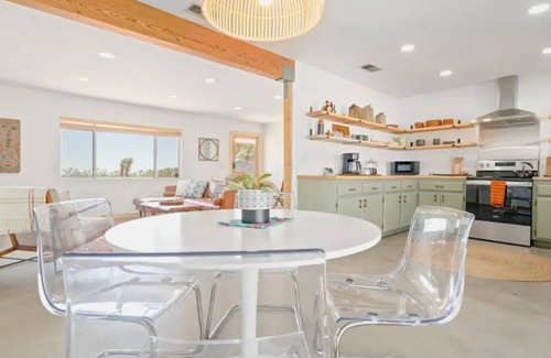 Situated on five sprawling acres, this beautifully renovated home is located in the best part of Joshua Tree - a mere 10 minute drive from the restaurants of Joshua Tree and the National Park Visitor Center, while still offering privacy and wide open views of the desert landscape. The home has been tastefully decorated inside and out and offers all of the amenities and comforts necessary for a magical stay. A perfect desert retreat or home base for couples, families and groups of friends.
