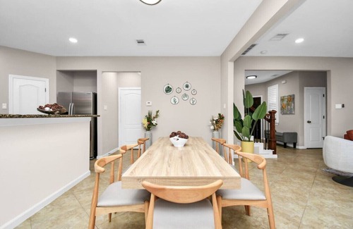 This spacious and tropical retreat offers the perfect blend of comfort, convenience, and leisure amenities, creating a welcoming and ample space for gatherings and relaxation and ensuring a restful stay for all guests. The home has an open-concept layout seamlessly connecting the living, dining, and kitchen areas