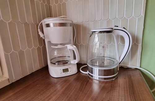 The large living room has an open kitchen. The kitchen is fully equipped, such as a large stove with oven and a refrigerator with freezer. As well as a microwave, coffee maker, blender, toaster and much more! 4 people can comfortably eat or play games at the dining table. Upon arrival, a basic supply of coffee, tea, spices and cold water is available for you.