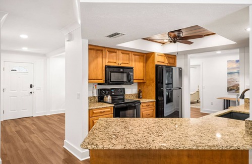Open concept floor plan with split bedrooms. Main Bedroom comes with walk in closet and full size large bathroom. Two other bedrooms shares full size bathroom with tub/shower. We have Tvs sets in Living Room, Kitchen/dining Room and Lanai.