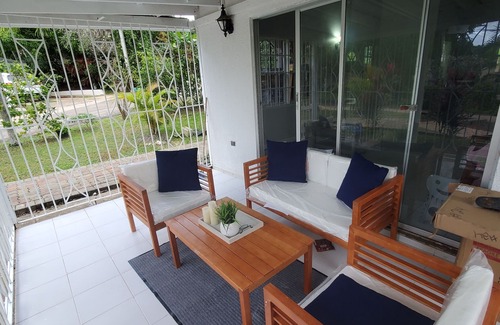 Tropical Getaway is open layout retreat surrounded by lush fruit trees, mountain views, and soft color changing garden lights. Behind our home is the community pool and tennis court( that is also used by residents to play football (soccer).