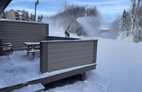 True Ski-in and Ski-out from your private rear deck on the Village Trail Slope. A remote-controlled gas-log fireplace will keep you warm and toasty as you look out over the Village Trail. Yes, The Winter Sonata Condominium, where the ski slope is in your backyard. Spend more time on the slopes rather than getting to the slopes. Ski-in from the Village Trail Slope onto the private rear deck of the condominium and ski-out from the same private rear deck of the condominium onto the Village Trail Slope and a 3 minute walk to Boomerang Trail. For winter stays from Dec 22, 2024 till March 15, 2025 there is the complementary use of a gas log fireplace with remote that also has a second protective standalone fire screen for safety. No walking around a huge building to get to the slope and no traversing huge open spaces to get to the ski-trail. (DISCLAIMER: Ski-in Ski-out is Weather Permitting i.e. if the weather is warm and there is no snow or insufficient snow on the Village Trail, then there is neither ski-in nor ski-out). Also the hot tub and pool are available from Memorial Day till Labor Day at the recreation center about 150 yards from the front door at no charge. During the balance of the year, hot tubs and an indoor pool is available at the lodge for a fee.