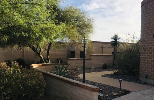 Private townhome 1,935 sq ft in Fairfield development, serene, quiet neighborhood/upscale area. Located in beautiful majestic Catalina Foothills and Arizona Sonoran Desert of Tucson, Arizona. Ridge top townhome overlooking four mountain ranges~awesome western sunsets on back patio (chaise lounges, dine outside/table, etc). In addition, enjoy 4 patio areas with outdoor furniture/cushions providing areas to enjoy coffee/dining/read/relax. This desert oasis is tastefully landscaped with bougainvillea, citrus, local cacti/flora. Easy to access nearby restaurants, upscale spas/resorts (Canyon Ranch, Loews Ventana, Westin La Paloma), grocery (Whole Foods, Safeway etc), UPS mail, medical/hospital, art galleries, walking paths, hiking (Sabino Canyon nearby), birding, biking, golf. HOA tennis courts/heated pool/spa privileges included with rental property~short walk from townhome. Two bedrooms~Primary/King bed-walk in closet & Guest/Double bed-large closet. Bathrooms (2) adjacent to each bedroom (both w/showers; primary has tub/shower.Fully equipped kitchen/stainless steel appliances, kitchen table/breakfast nook, pantry, reverse osmosis/kitchen water system Dining room with table/chairs & adjacent living room/flat screenTV/DVD (streaming capability), sofa/chairs/lamps. Den/office w/contemporary sectional couch,TV/DVD (streaming capability),Hi Speed Internet, office desk/HP printer. Air Conditioning/Heat. Linen closet, laundry (HE washer/dryer). Double Garage (remotes)attached to house (walk thru straight into home).