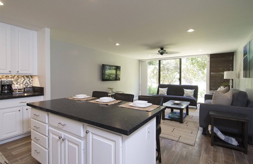 This legal non-smoking unit is located at Kui'lima East Condo's at Turtle Bay Resort on the famous North Shore of Oahu. Situated next to the 17th hole of the Fazio course, this spacious 820 square foot one bedroom, two full-bath unit has everything you need to relax in style. This stylish location provides a cal-king bed on a custom built frame, a full sleeper-sofa and couch in the living room, porcelain tile throughout, tiled showers, fresh paint, wall-mounted flat screen TV's, AC units in bedroom and living room, granite counter tops, stainless steel fridge, stove/oven, microwave, dishwasher, under cabinet lighting, recessed dimmable lighting, custom built night stands, coffee table and end table all topped with matching granite. Floating entertainment system below TV's, wood cabinets, under mount sink, in-unit washer and dryer, designer area rug and bar stools. Beach chairs, umbrella, beach towels and a cooler are ready for use. Bath towels, shampoo and conditioner are also provided. For those who cook, the kitchen is stocked with numerous tools including pots, pans, plates, bowls, silverware, cups, coffee maker and more!