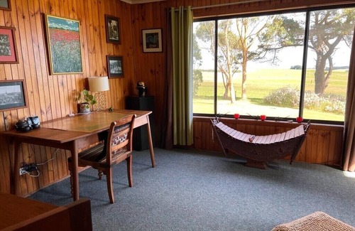 The house has three living areas - one with a library - and a kitchen with a view to the Southern Ocean across rolling hills.