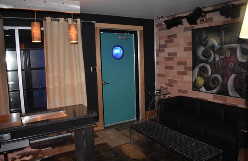 Bigger isn’t always better. This Frank Lloyd Wright inspired single-level 500 square foot flat contains the warmth and beauty that only natural wood can conjure. With the salt-and-peppering of walnut against ambrosia maple, wood tones take their turns softening the concrete, steel and commercial storefront glass, which empowers it’s industrial backdrop placing this well-appointed pad on a pedestal. Smaller in size than its big brother barracks (The Hangar Lofts + 006 VRBO # 1078073 & The Industrial Loft / Urban Living VRBO # 994253), this flat epitomizes creative efficiency. Next generation detailing on both the kitchenette and bathroom leaves its elders a touch envious of this fellow 5-Star flat.