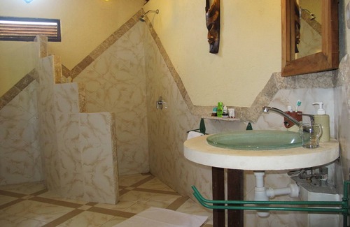 Our Ocean view bungalows have sea view and are all equipped with electrical air-conditioners. Warm water is provided by our solar powered water heater that works entirely with sunlight of which we usually have plenty in Amed.