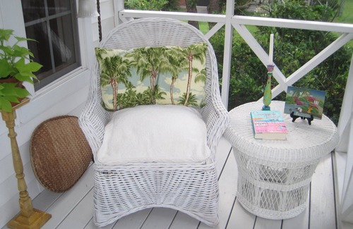 This enchanting one-bedroom cottage is nestled under twin palms, their fronds rustling in the summer breeze. It is just steps away to the beautiful Back River beach, barefoot strolls in the sand, and breathtaking sunsets. It represents the classic guest cottage with French doors, painted wood floors, bead board walls, wicker and vintage furnishings.
