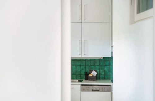 Next to it, there is the dining area with a table for 4, facing the large window that leads to the spacious furnished terrace. Have lunch and dinner al fresco here in warm weather and enjoy the mild Ticino climate all year round! The separate kitchen is complete with appliances and everything you need to prepare meals like at home.