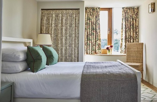Each bedroom has its own distinct colour scheme, incorporating fabrics by Flora Soames throughout. A master suite with a four-poster bed and its own roll-top bath sits opposite a twin room upstairs, while five cosy bedrooms can be found on the ground floor, each one with its own ensuite bathroom or shower room.