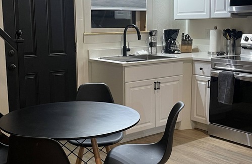 The North Peak at Two Peaks Cabins offers a tall vaulted natural wood ceiling, reclaimed wood design accents, serene front porch, fully equipped kitchen with ice maker, big screen TV, WiFi, and comfortable queen size beds in both bedrooms. There is plenty of parking and room for a boat with electrical and water hookup. Two Peaks offers 2 neighboring cabins perfect for traveling with a group. These beautiful white cabins are clean with brand new amenities. Two Peaks Cabins are located at Willow Springs on Lake Texoma. Marina, boat ramps, and beaches about a mile away. About 13 minutes from Choctaw Casino. The area is golf cart friendly.