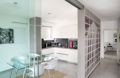 Next door, separated by a glass window, the dining area with a beautiful glass table and designer chairs: enjoy here a dinner prepared with local products in the modern kitchen, complete and equipped with appliances and everything you need to prepare and serve meals.