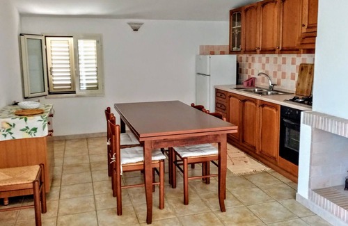 large quadrivano with a comfortable kitchenette with a fully equipped kitchen in the dining room which can be connected to the external veranda through a large windowed door; 3 large bedrooms with two beds each and non-fixed mosquito nets; equipped bathroom with shower and exclusive washing machine; in common outside: oven and outdoor barbecue with equipped table under ancient tree, external sink, large garden with seasonal fruits, free parking at the house and at the beach; accessible terrace with internal staircase to the second floor