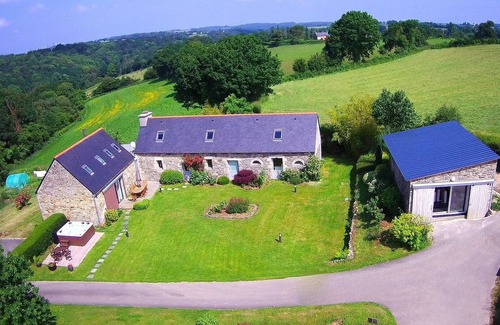 This old barn is in an exceptional setting, quiet, with stunning views of the valley and the first high reliefs of the mountains of Arrée. It is located 15 minutes from the beach and 5 minutes from Guerlesquin a small city of character with all amenities and shops. The surrounding villages Ponthou and Plouegat Moysan (2 minutes) offer local shops. Lesleac'h is located at the foot of the GR 34 and GR 380 and the hiking possibilities are very vast.