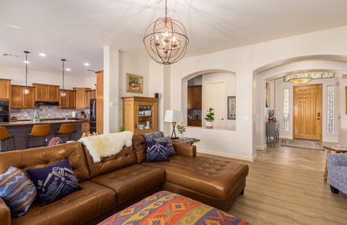 Guests will enjoy 5 spacious bedrooms all on one level, a large kitchen open to the living and dining rooms with granite counters, stainless appliances, and a large island where the entire family can gather. Step outside and the fun really begins. Relax in the luxurious backyard next to the heated pool and spa, or enjoy a night under the stars next to your choice of two firepits! A large dining table, outdoor TV and fully equipped poolside BBQ station with mini fridge and bartop officially checks all the boxes for the perfect vacation rental! Book your Arizona getaway today!