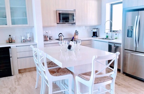 You'll have everything you need for preparing meals while gazing at the Pacific blue waters. Our fully equipped kitchen has modern stainless steel appliances and wine cooler, spice rack, coffee maker, high end pots and pans, storage containers, additional cold brew coffee maker, plastic glasses for the pool and more.