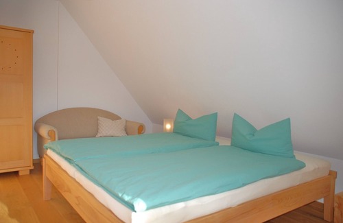 Das Passivhaus steht für hohen Wohnkomfort, frische Luft in allen Wohnräumen, Schimmelfreiheit und hohe Umweltfreundlichkeit. Unser Haus ist Gewinner des Architektenwettbewerbs in Bayern 2018. Die neue, helle Ferienwohnung (2017, 68 m2) mit eigenem Zugang, großer Dachterrasse und tollem Ausblick befindet sich im Obergeschoss. Sie ist Teil eines Passivhauses und verfügt über ein Lüftungssystem, damit stets Frischluft vorhanden ist. Die Unterkunft ist aufgeteilt in Flur, Bad, zwei Schlafzimmern und Wohn- Essraum. Die Räume sind mit Natursteinfliesen, Eichenfußböden und Massivholztüren ausgestattet. Die Einrichtung besteht aus modernen Naturholzmöbeln. Im Wohnbereich befindet sich eine komplette Küchenzeile mit Esstisch und Stühlen nebst Polstermöbeln, TV-SAT und Radio. Ein Schlafzimmer beinhaltet ein Doppelbett, Kleiderschrank und ein Sofa. Das Einzelzimmer hat Bett und Kleiderschrank. Die Dusche im Bad ist ebenerdig. Die Ferienwohnung besitzt eine Fußbodenheizung und im Wohnraum zusätzlich einen Holzofen.