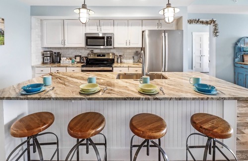 The well-appointed kitchen is fully equipped with all the necessary amenities and appliances to make you feel at home. You can cook your favorite meals and enjoy them in the adjoining dining area, which offers a beautiful view of the beach. On top, you'll be able to enjoy a coffee bar with both types of coffee makers and the supplies you'll need for that cup of Joe in the mornings!
