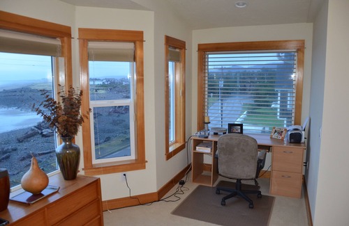 A gourmet kitchen equipped with a sub zero refrigerator and Wolf stove flows into the dining area and living room. The living room also boasts a flat screen TV with cable. The living room and dining area sports an unequalled view of the ocean from the tip of the Washington Peninsula to Tillamook Head. A small deck will allow you to view the amazing sunsets while enjoying a glass of wine and a fresh crab cocktail.