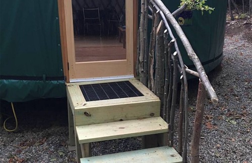 The yurt is located outside our residence, approximately a 200 ft walk up from the provided parking area. Please refer to the photos above of the path up if you have any concerns. The short walk is comparable to a flight of stairs.