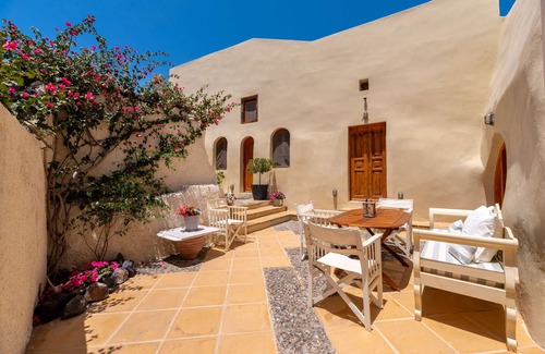 An Island Retreat: A holiday here affords the visitor a unique opportunity to experience the magic and tranquility of traditional Greek island village life, broken only by the sound of occasional church bells or the bray of a donkey, as it was 50 years ago, prior to the earthquake of 1956. Its serene setting provides both privacy and a retreat from the hustle and bustle of a resort or hotel while being situated a mere 15 minutes by car from the capital of Fira or only 5 minutes from the beautiful, black, sandy beach of Camari, both with a myriad of restaurants, cafes, bars, and clubs to cater for any taste. Whether you're a party animal or just want to get away from it all, this property is ideal for large groups or small -both outdoor and indoor entertaining. Savour Greek Island Life: During your stay, watch the sunrise from the expansive terrace, the moon rise out of the sea in Camari or take a short ride up to the neighboring village of Pyrgos and Santo Winery to see a magnificent sunset, away from the crowds. Alternatively, take a stroll through the village, with its air of mystery, and stop at Canava Argyros or Roussos to sample a glass of locally produced wine from sun-drenched grapes grown in Santorini's volcanic soil. Take a litre of 'Brusco', or 'Vinsanto' directly from the barrel home with you to enjoy before or during dinner. Then again , after a long day at the beach, you may prefer either to enjoy the quiet of a simple, home cooked dinner on the terrace, take in a movie down the road at one of the most beautiful, charming open-air cinemas in the Mediterranean or venture out to experience the some of the exciting night-life the island has to offer. Whatever you choose, your stay here will bring memories to last for a lifetime.