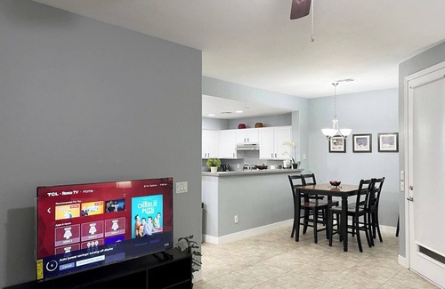 The townhouse features a well-designed floor plan with high ceilings and large windows that fill the space with natural light. The kitchen is fully equipped with modern appliances, including a refrigerator, stove, oven, microwave, and dishwasher, as well as all the cookware, dishes, and utensils you'll need to prepare meals. The living room features a comfortable sofa and flat-screen TV, while each of the three bedrooms includes a TV for your entertainment. The bedrooms offer a variety of sleeping options, including a king-size bed in the master bedroom and two comfortable queen-size beds in the other two bedrooms. Each bedroom also offers plenty of storage space. A half bathroom is located downstairs for added convenience.
