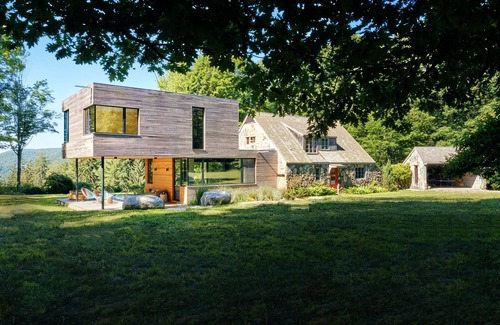 Located in Cornwall, this house is a dream. Owned by 2 architects, it blends the historic old stone cottage with an exciting modern addition. Huge views are open to the south. With 4 bedrooms including 1 king, 2 queen, and 2 twin beds, guests will have plenty of space to unwind. The 3 bathrooms offer a bathtub, shower, and hair dryers for added convenience. The newly renovated garage has an office loft for when you need a quiet place to work. There are 2 wood fireplaces. The cozy den off the kitchen creates a social hub for cooking and playing games. The kitchen is well equipped for any meal. There is a large gas grille of the terrace. The covered terrace has an outdoor seating area, picnic table and 8 person hot tub,