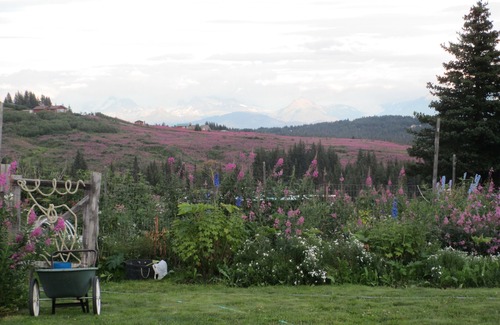 of local Stika Spruce in Homer.. Sits 1000 ft above Kachemak Bay and Cook Inlet affording beautiful views on 6 acres. House is 1600 sq ft with 600 sq ft decks. Beautiful features inside, including diamond willow staircase,remodeled bathroom, custom kitchen, large view windows. Wood stove, great old upright piano, and the first windmill in Homer. Very good deep water well.. Large organic gardens and lawns around property.. Vrbo #148999 is also located on property making a larger group gathering easy if available ...