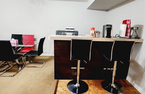 This stylish basement suite has a unique furnished spacious living room with beautiful accent chairs, 55 Inch smart TV, Large 6 seater dinning table with a dedicated work station and fast speed internet. This suite has a self check-in smart lock and the unit can take up to two guest. The unit has a separate entrance through the front attached garage and a private access into the unit. This location is 19 mins drive from Calgary Airport . Banff National is only about 1 hour 35 mins away. The unit has one bedroom with an elegant queen size bed and tastefully furnished living room with a private work station for your comfort. The unit is designed to give you the required ambience and comfort you desire. We are located in a safe, serene, quiet family oriented neighborhood of the city. We look forward to welcoming you.
