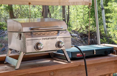 This tent features a front porch with two chairs, a gas grill, and a picnic table. Additionally, there's a fire pit in front of the deck for a cozy and intimate experience during your stay.