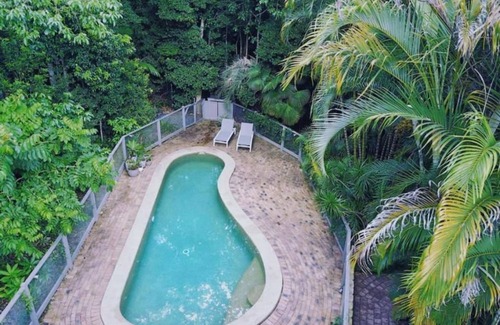 Escape the bustle of Byron Bay and enjoy the serenity and peace of a Rain forest retreat on 15 acres just four minutes drive from the heritage village of Bangalow. Private newly renovated Guest suite consisting of bedroom with own bathroom and separate entrance. Guest area is locked off from the rest of the house. Guests have their own off street car park (not undercover), with designated pathway to their private entrance...Room has small deck overlooking the in ground swimming pool.