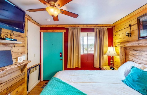 Utilize the kitchenette's fridge, microwave, and coffee maker to whip up tasty treats, and utilize the room's ample storage space to store all of your adventure garb. A handcrafted headboard, custom lighting, and a ceiling fan wrap up the cabin's stellar amenities.