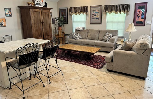 Our home features custom cabinets. In addition, we have antiques and handmade furniture throughout the house. Kitchen is custom built with everyday dishes and fine dining service pieces. Bath and electrical fixtures are upgrade. There is a spacious screened porch and a area for relaxing and grilling. Full size laundry machines are included. All linens and cooking needs are on hand. Microwave, hair dryers, streaming tv and wireless internet are included.