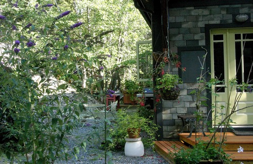 Slate House is a spectacular and unique post-and-beam artist's home, located in a private wooded setting just around the corner from the picturesque village of Bernard, where the town dock and local favorite restaurant Thurston's Lobster Pound is located. The colorful and comfortable interior has a large, open living area upstairs, along with a kitchen equipped for the gourmet cook, a cozy master bedroom/bathroom with a beautiful tiled shower, and a deck outside the bedroom door. The artist owner, who lives on the property and works in her studio here as well, maintains an extensive landscaped garden as well as a small orchard and vegetable gardens - guests are welcome to roam! The living room and bedroom look out onto a small, peaceful perennial garden and the woods beyond.