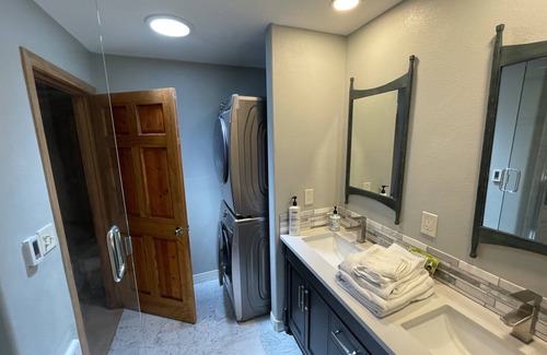 Upon arrival there's a dedicated parking space. The double French doors have a digital lock eliminating the worry of carrying a key. Once inside there is a great room with a kitchenette, island with seating, a dining table and chairs and a living room. There is a bedroom with a king size bed, desk, chair, nightstands with lamps an armoire plus double closets with drawers. Large stone fireplace, skylights and numerous windows for a cozy feel. In the summers enjoy the sound of the creek that runs alongside of the apartment.