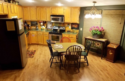 The dining area has a dining table & 4 chairs. The kitchen has stainless appliances that include a range, microwave, dishwasher & refrigerator with icemaker & an abundance of counter space to prepare meals while visiting with family & friends in the adjoining living area. There is also a toaster, blender, George Foreman grill, slow cooker, Keurig & regular coffee maker.