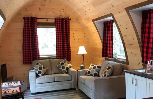 Stay in this unique wooden POD. This unique POD offers the guests space and all the latest amenities expected. The 12 foot apex height ceilings in the living areas give the POD a spacious and bright feeling. The POD has separate Living Area with dining table, bedroom with Queen sized bed and a whirlpool tub. A separate shower room with complete facilities. It also has a Kitchenette offering Twin plate, microwave and fridge freezer.